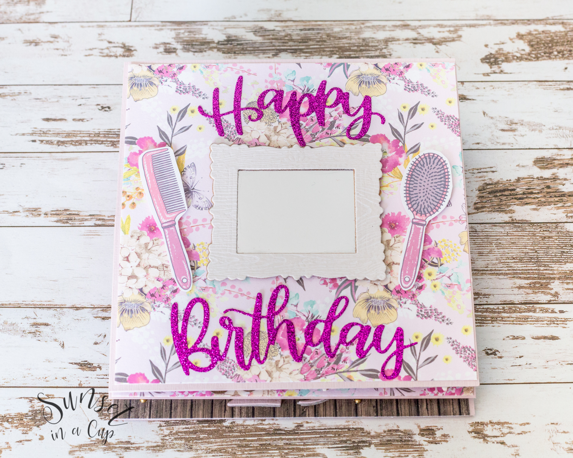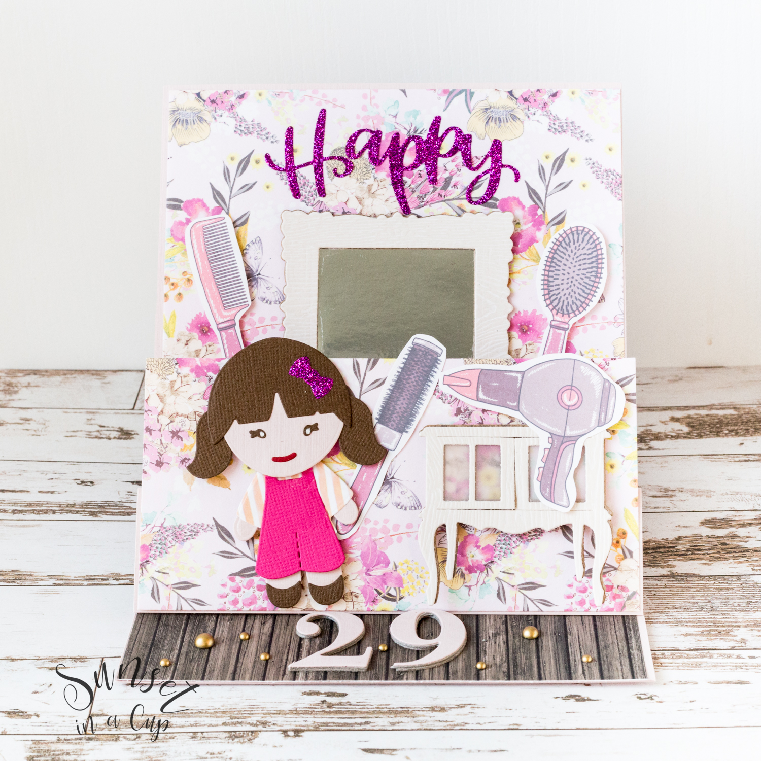 Con questi sentimenti ho creato anche questo biglietto, nato per augurare buon compleanno ad una ragazza i cui ferri del mestiere sono spazzola e phon! Chi me l’ha richiesta mi ha specificato che avrebbe gradito i toni del rosa, e qualche elemento tridimensionale. così ho pensato di riprodurre un pinkissimo 😀 salone di bellezza, specchio incluso, in questa card che può essere chiusa molto comodamente in una classica busta, ma si apre a sorpresa diventando una scena tridimensionale.